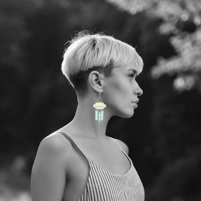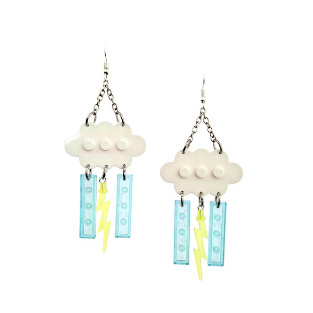 Light blue rain and yellow lightning hang from a cloud-shaped plate. Connected with a chain to an earring hook.